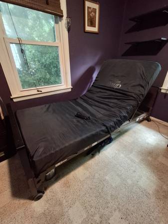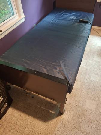 Dark brown electric hospital bed. With matrice and sliding security side bars.