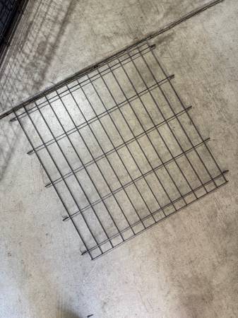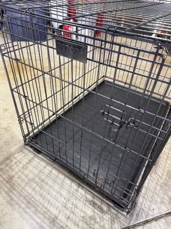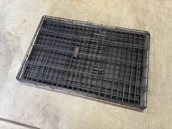 It measures about 36" long x 26" tall x 23.5" wide. It does show some signs of wear. It has two doors, a plastic removeable base, 4 rubber feet, a clip to secure it while folded, and a removeable crate divider. Please let me know if you have any questions.