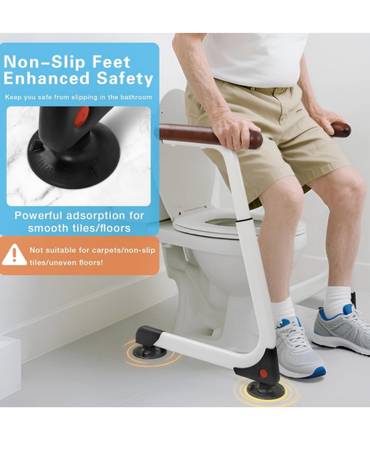 【TOILET RAIL SAFETY & STABILITY】:This toilet bars is made of sturdy metal material and natural wood. The toilet frame is very sturdy in construction and has a weight capacity of up to 350 lbs. The four support legs of the toilet rails are equipped with non-slip suction cups, which increase the floor grip and prevent slipping or tipping, ensuring stability and safety when getting up from the toilet. The non-slip suction cups of the toilet hand rails are suitable for all floors, except uneven floors and non-slip tiles