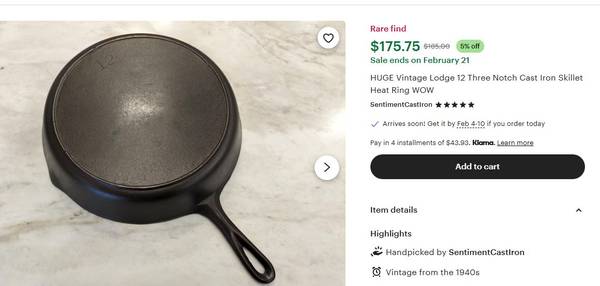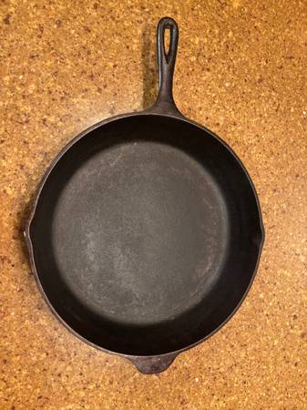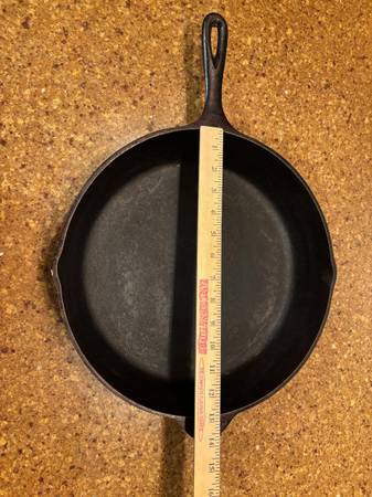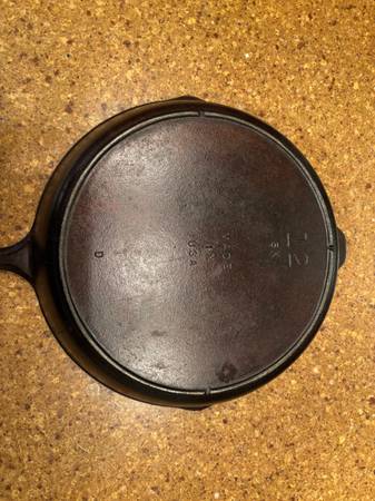 Vintage 3-Notch Lodge #12 Cast Iron Skillet from the 1940 - 1950's. Large skillet almost 14" on the top edge, base is 12". Inside is 13" $175 or best offer. OBO