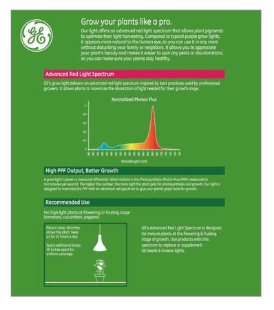New GE Grow Light for flowers, fruits, indoor plants, house plant, etc It uses a medium base so you can screw it into standard lamp sockets There are technical specs pictured on the box