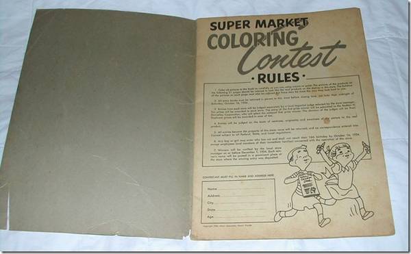 Vintage Super Market Coloring Contest Book, copyright 1954. Measures 8" wide and 11" tall. Condition 4 pictures 1/4 colored with crayons, outside cover tears and wear, no pages missing, but discolored from age.