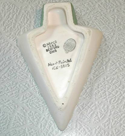 Napco 1962 Hand painted Ceramic Miniature Christmas Tree Ashtray. Has original label National Potteries Co., Cleveland, Ohio, Made in Japan. Also marked Napco 1962, Bedford, Ohio and Hand-Painted CX 5615. Ashtray measures 3" wide at bottom of tree and 4-5/8" tall. No cracks or chips.