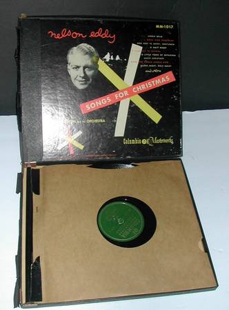Nelson Eddy, Barton, with Chorus, Paul Wiston and his Orchestra, Columbia Masterworks Record Set, Copyright 1951. 4 Vinyl Records, 33-1/2 RPM and 9-3/4" in diameter. Songs, Jingle Bells, Joy to the World, Good King Wenceslas, Away in a Manger, God Rest Ye Merry Gentlemen, O Holy Night, O Come All Ye Faithfull, O Little Town of Bethlehem, White Christmas, Hark! the Herald Angels Sing, The First Nowell, Deck the Hall with Boughs of Holly and Silent Night Holy Night.