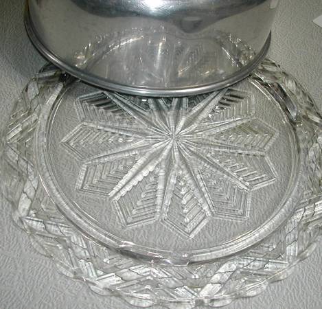 Vintage 1950-60's Cake Saver Aluminum Lid with wood knob handle, measures 10" in diameter and 4" tall, 3 footed Glass Plate with snowflake center design, measures 11-1/4" in diameter, plate has no chips or cracks.