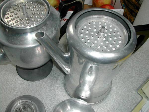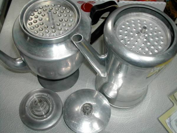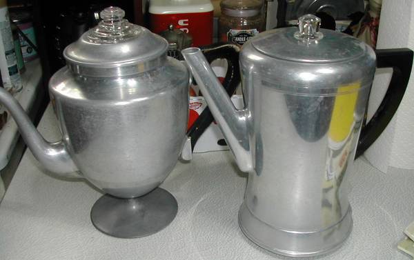 Vintage West Bend Aluminum Co. Flavo-Matic 8 Cup Automatic Percolator Coffee Pot, Catalog No. 3278F Patents Applied for, no cord, untested and plus Stove Top Coffee Pot Percolator, do not know brand.