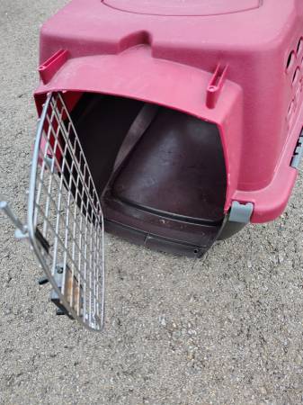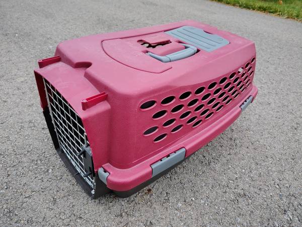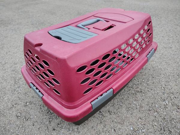 Dark red cat kennel crate in nice condition. Could hold a large single cat or similar small sized dog. Dimensions are approx 22 inches long by 13 inches wide by 12 inches tall. It has a front-loading door. Everything is in perfect working condition.