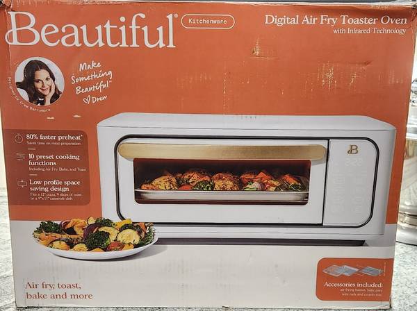 Embrace a world of possibilities with the Beautiful™ Digital Air Fry Toaster Oven with Infrared Technology. This compact yet versatile kitchen essential seamlessly integrates multiple functions and cooking techniques all in one sleek package. Its space-saving design can accommodate various food items, such as a 12" pizza, 9 slices of toast, or a 9x13" casserole dish. With 10 preset cooking functions, you can go from toasting to air frying, broiling, baking, and even pizza-making and more. Created by Drew Barrymore, Beautiful™ combines elegant design, contemporary colors and modern silhouettes for high-performance appliances that look beautiful on your kitchen counter. Condition: new.