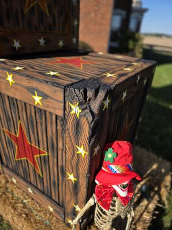 This Halloween display includes three extra-large circus crates. They are designed to look like aged wooden shipping crates but are actually hand-sculpted from foam and hard-coated to create a durable finish suitable for outdoor display.