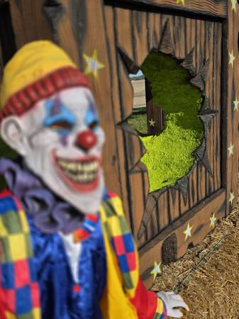 Crate One: Features a large hole running through the entire shipping crate, giving the illusion that something—perhaps a spooky clown or goo monster—has broken its way out.