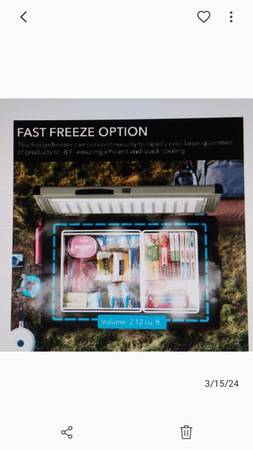 Brand New in box Whynter Portable Fridge / Freezer offers premium quality and innovative design to your frozen/refrigerated needs. This freezer is great for RVs, boats, campsites, fishing trips and is truly portable so you can take your fridge / freezer anywhere! All you need is either a standard household 110 Volt outlet or a 12 Volt power source, like an automotive battery. Whether on a day trip or major expedition, you can easily keep your food and beverages chilled, or frozen with this benchtop freezer. The Whynter portable freezer / fridge is a true freezer / refrigerator which cools be The Whynter portable freezer / fridge is a true freezer / refrigerator which cools between -8°F to 50°F.tween -8°F to 50°F. Fast freeze mode rapidly cools to -8F. Volume: 2.83 cu. ft. or 85 quart.