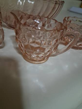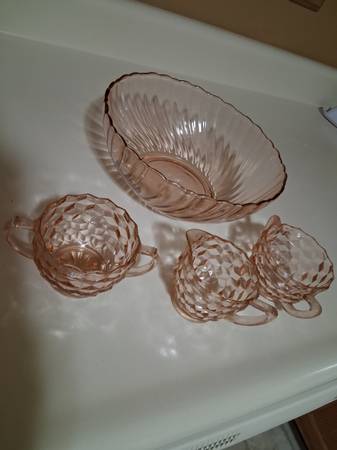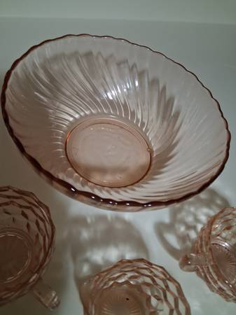 Rosaline Pink Swirl Serving Bowl and Jeannette Depression Pink glass and creamer bowl