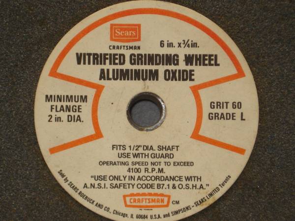 Craftsman 6 inch x 3/4 inch Vitrified Aluminum Oxide Grinding Wheel Grit = 60 Grade L 1/2 inch shaft I do not think this wheel has ever been used. CASH ONLY