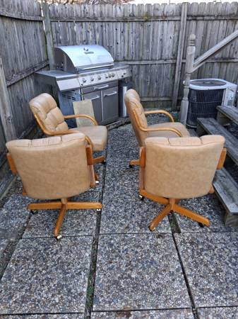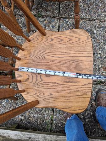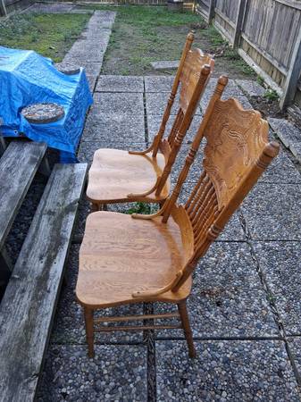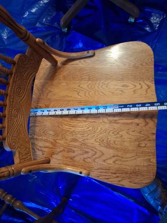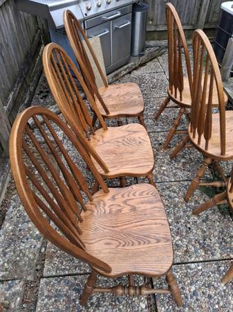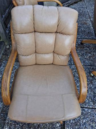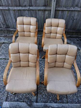 6 arrow back oak chairs one & a quarter inch thick very sturdy & in good condition $180.00, 2 press back oak chairs good condition $60.00, 4 oak & marine vinyl rocker, swivel, chairs for dining table or gaming table on castor & easy to roll around $300.00 all are in very good condition.