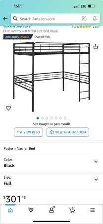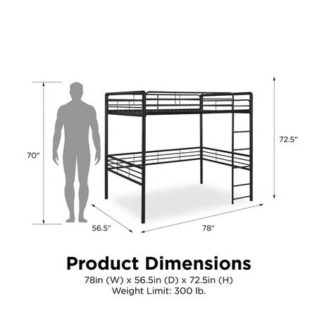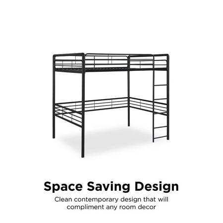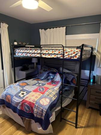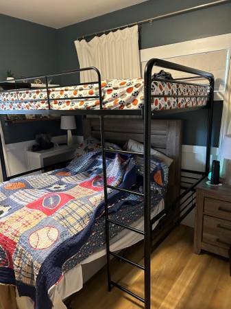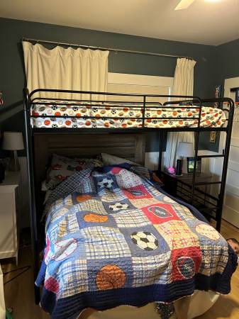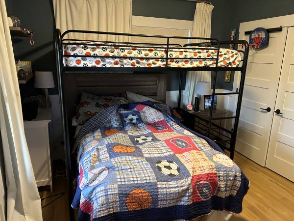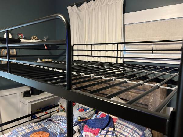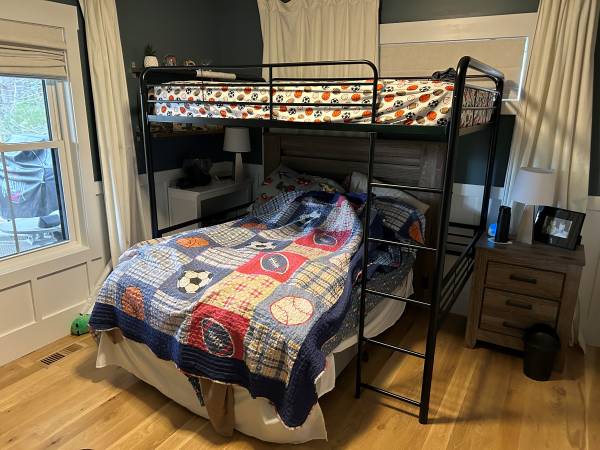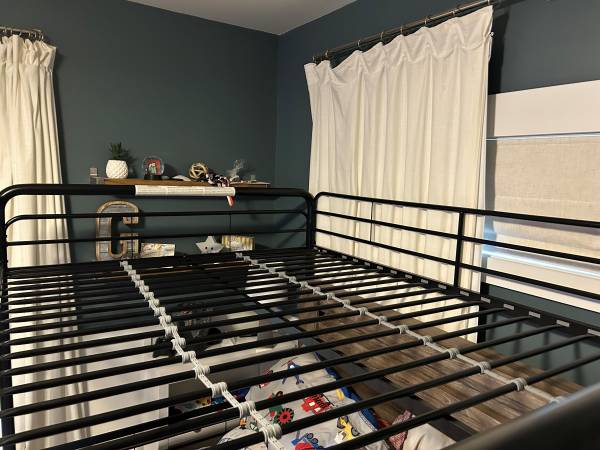 For sale is a DHP Tommy Full Metal Loft Bed. It is in excellent condition, practically brand new, it was only used for a very short period (~2 months) during a remodel where two kids had to stay in one room. We installed it overtop of an existing fullsized bed (as shown in photos), but it can also be installed to allow for a desk or other open space below (as shown in the stock photos). It has been disassembled for easy transport and can fit in any sized vehicle to be put together in your desired location. I still have the installation instructions, it is very easy to assemble, all the necessary parts and pieces are included and labeled accordingly. I believe we paid ~$275 for it, but it is currently listed on Amazon for over $300. I can’t personally comment on its comfortability, but my 7 year son had no complaints, lol. Some features of the loft bed include: