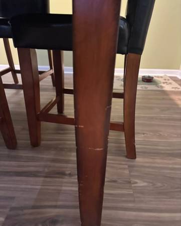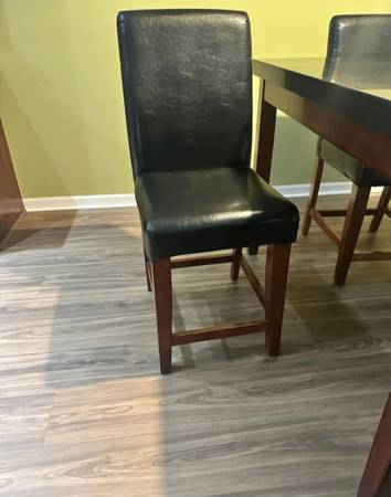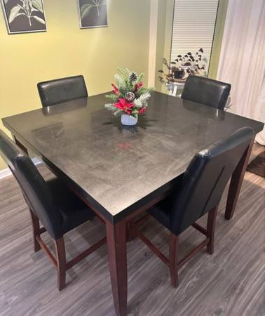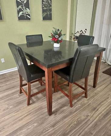 Black granite table top, cherry wood legs , 6 matching chairs 54 x 54 square , 36.5 high . Legs are removable for transport . Two - Three people required, very heavy.