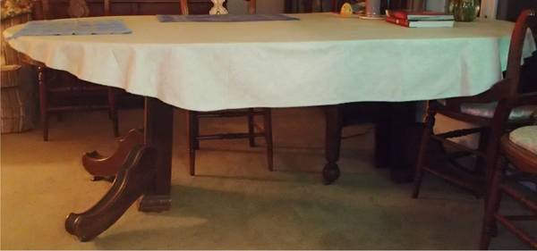 ● Pedestal dining table, on casters: 45" round with 5 leaves (each one 9" wide); at full extension, table is 90" x 45" (seats 10).