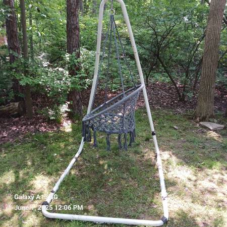 Pre-owned gray hanging rope swing chair with all hardware include carabiner, swivel and 4 ft. heavy duty chain. Excellent condition. Does NOT include chair stand. If you also wish to purchase the...