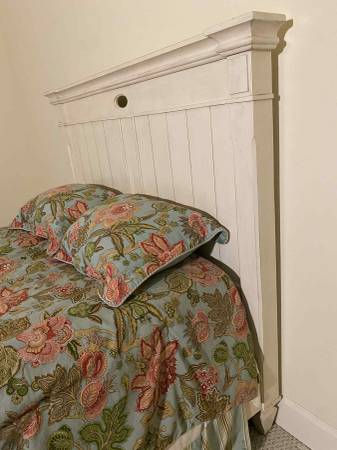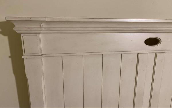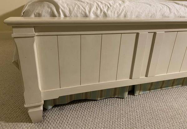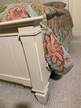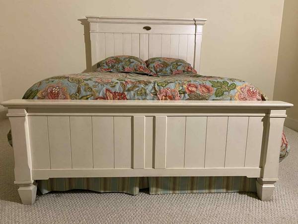 Linden Street designer queen bed frame, off white shabby chic antique/weathered finish to hide dust and forgive dings and usual wear. Includes decorative headboard, footboard, side boards, and many slats to hold up any thick and heavy mattresses. Sturdy, substantially heavy, solid wood construction. Measures 68"Wx89"Lx59"H. Asking $190. Pickup in Dublin by Coffman HS.