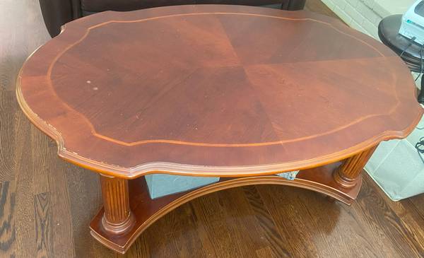 1 oval wooden coffee table: 50" x 32" x 21" H 2 small tables: 25" x 25" x 26" H