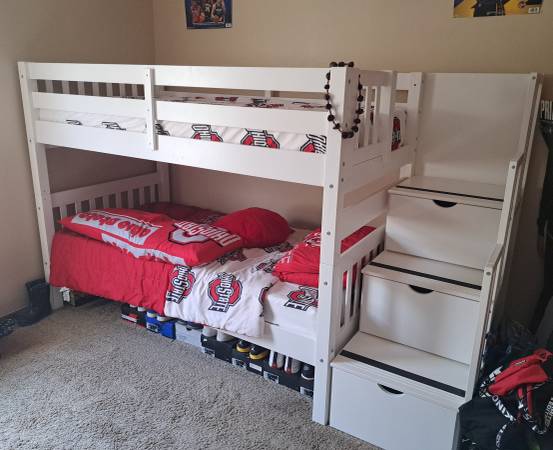 Twin over twin stairway bunk bed in excellent condition from a non smoking home. Purchased new from BunkBed King. This bed is solid Brazilian pine - no particle board! The stairs can be assembled on the left or right side. The bed can be separated into two twin size beds as well. You do not need a foundation or bunkie board as there are slats for the top and bottom bunk. Price listed is for the BED ONLY. Two memory foam mattresses (also in excellent condition) can be purchased for an additional cost if interested. Bed will be disassembled and you will need a large SUV or truck for pickup. Public meet up & cash only.