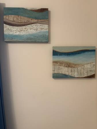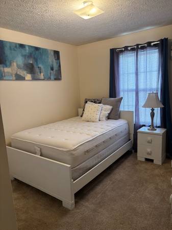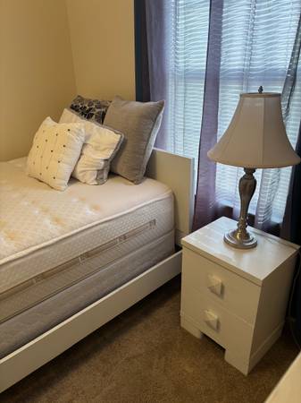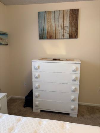 Guest Bedroom contents for sale. All items in shown in photos. Full size bed with clean raised mattress and boxspring, dresser, night stand, and all wall decor shown in photos. Including lamp and...
