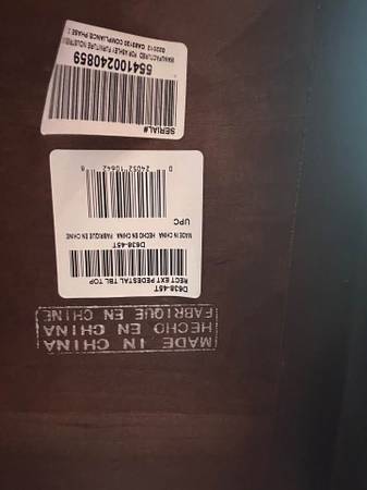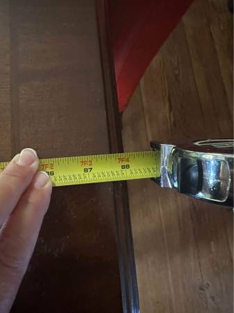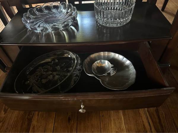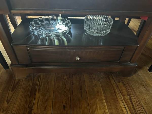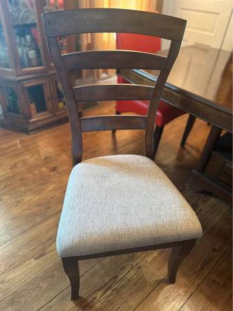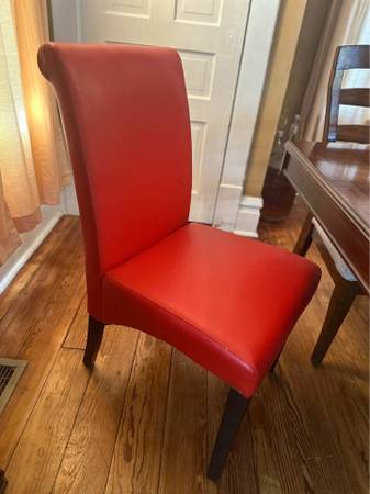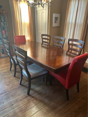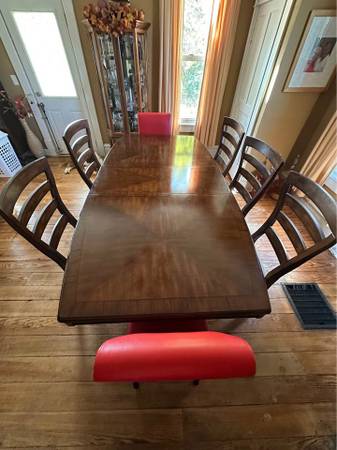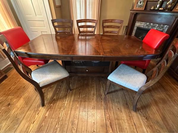 Ashley Furniture dining table with 5 chairs and 2 faux leather red accent chairs. Extendable with leaf. Dark wood. Under table velvet lined storage drawer. Like new with one small blemish on...