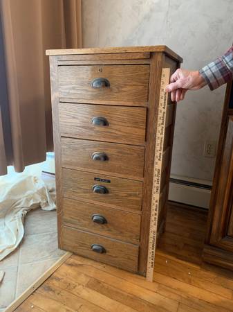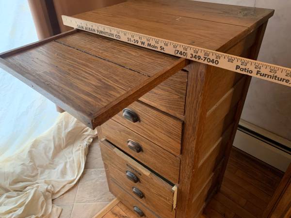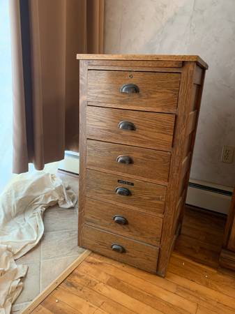 This is a small chest of drawers made of real wood (heavy). About three feet tall - see pictures. Has a retractable desk in top. Could be used for filing, craft supplies, or a small dresser. Pick up...