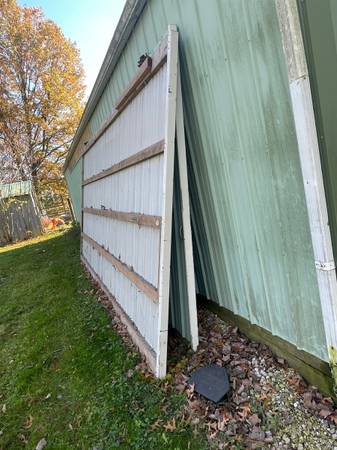 Pair of barn doors with hardware for sale. They are 8.5X17ft and have been disassembled. You are responsible for hauling.
