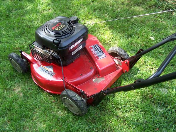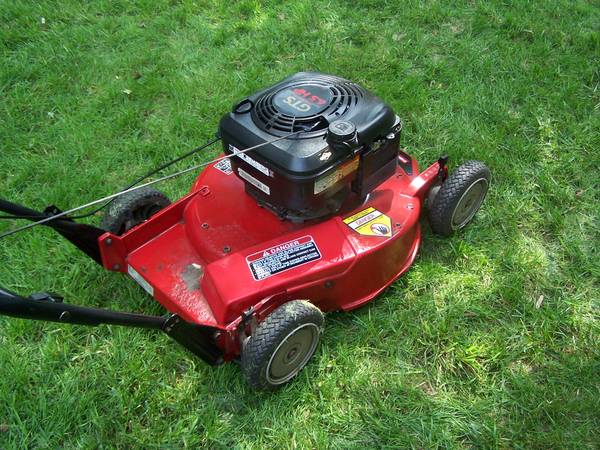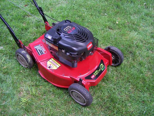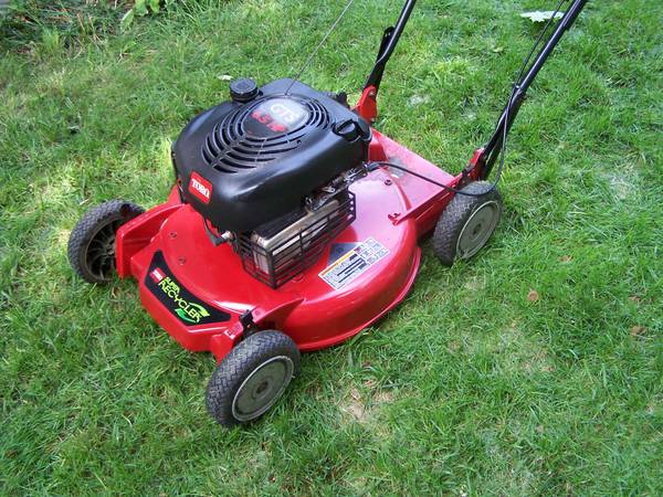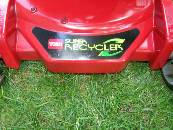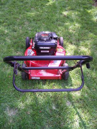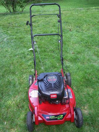 Powerful Made in USA Toro super recycler push lawnmower or trim finish mower, has the primer so the mower starts right up usually first pull. Lightweight and easy to use pushmower. Easy to maneuver. Great trim mower or edger trimmer. Very heavy duty with the big engine but also fuel efficient lawnmower, currently setup as a mulching mower and really does a great job mulching leaves and grass into nothing but can also easily be changed from mulch to a rear baggar