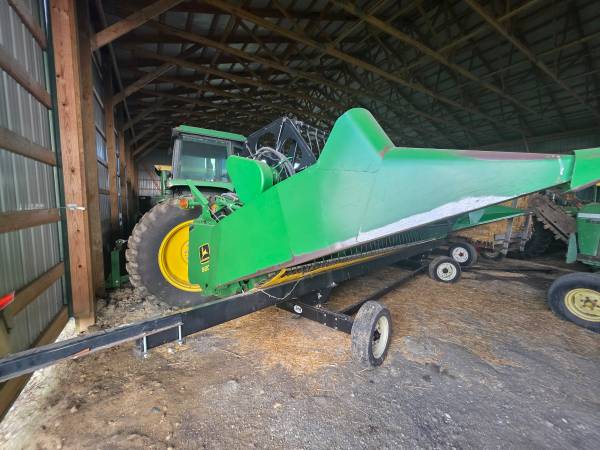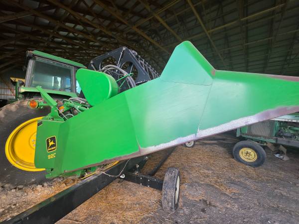 John Deere 920F grain head with fore/aft, stainless pan, rock guard, stubble lights, field ready, header cart not included