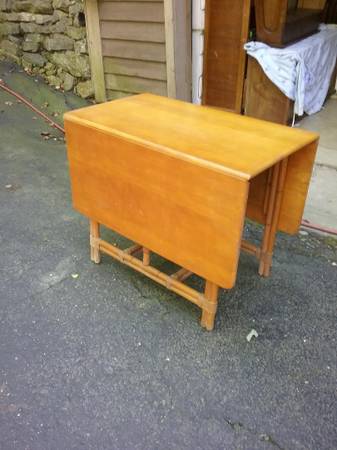 Have available this Heywood Wakefield table measuring 36Lx20Wx29H with 2 18in drop leaves. Need more info email or call. see sample pics below