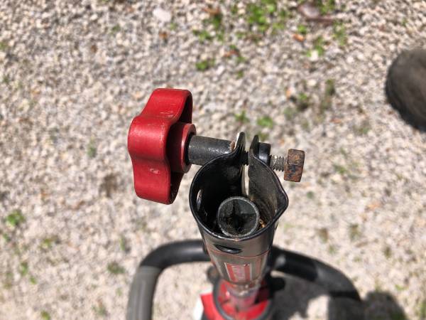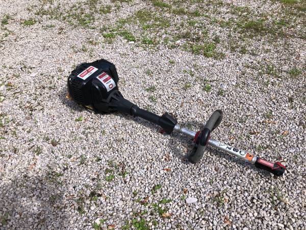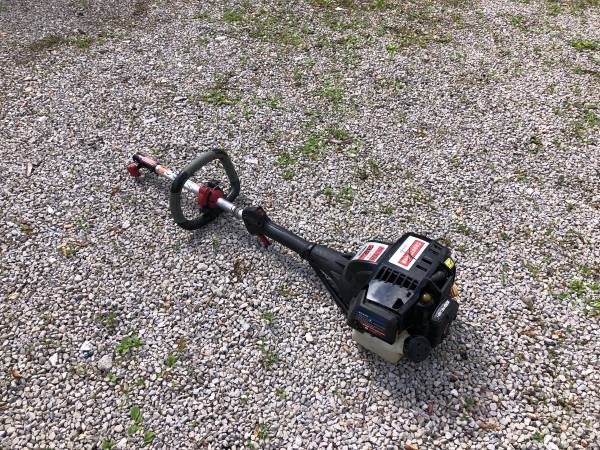 Craftsman 32 cc 4stroke gas power head. Uses common attachments with round tube and square cable (Craftsman, Ryobi,TroyBilt Toro and others). Pull start or power start with drill attachment available at Lowe’s or on the Internet. Starts and runs.