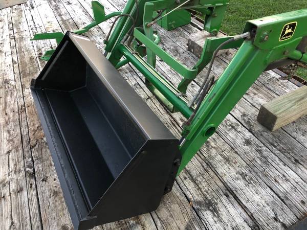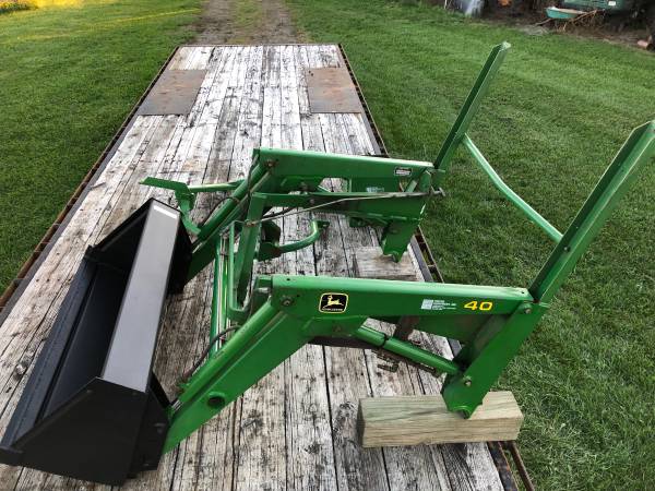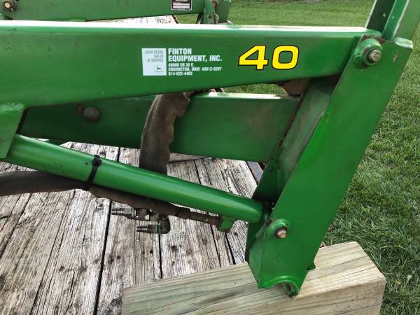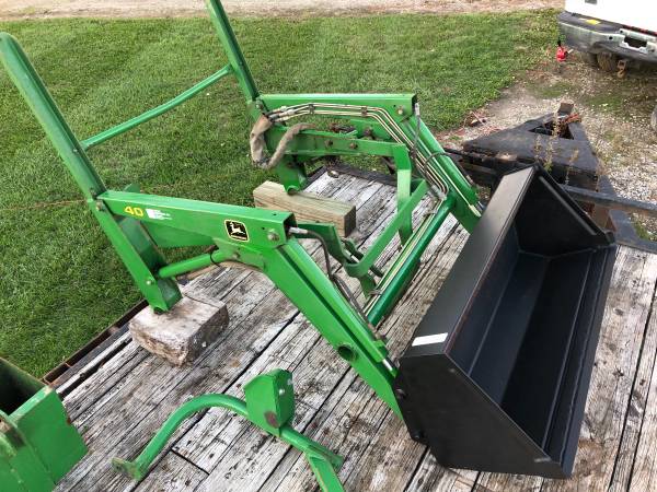 John Deere Model 40 Loader assembly for JD 455 445 425 garden lawn mower tractor. Original Equipment JD loader. Includes mounting brackets and ballast weight box for rear. Loader has quick connect fittings. Uses tractors existing hydraulic levers to control loader. Cutting edge is excellent with little to no wear. Scrapes and scratches here and there.