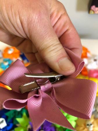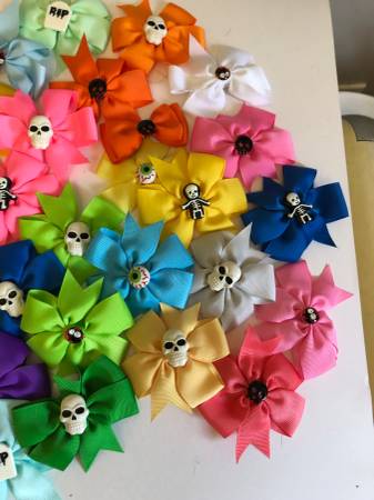 46 super cool goth hair bow clips. brand new. each measures about 3 inches wide and the few smaller ones are about 2 inches wide. each has a sturdy metal clip that holds onto the finest hair.
