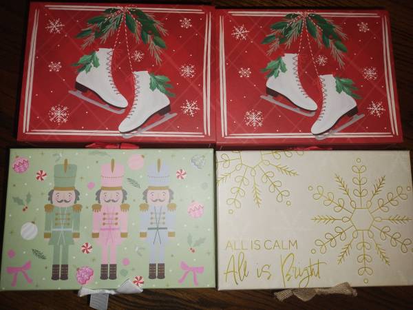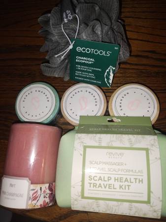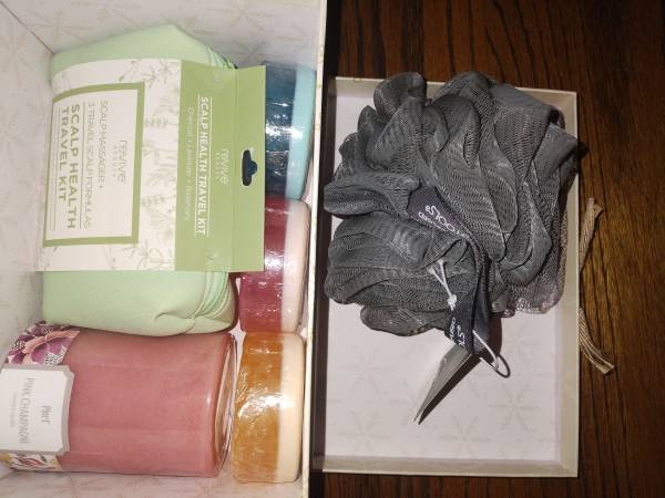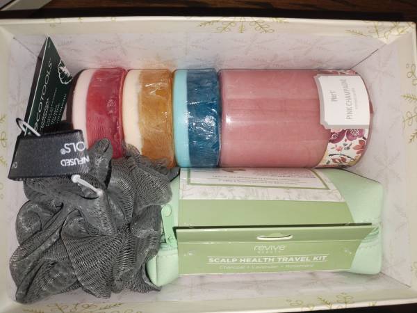 Pamper someone special this Christmas with a spa gift box of hand selected premium bath items featuring: Revive Beauty scalp care set (contains shampoo, conditioner, scalp treatment and scalp massager), Pier 1 champagne scented candle, EcoTools loofa, and three Sarah Swanson premium soaps — beautifully boxed and ready to gift in a sturdy reusable Christmas themed box. I have four available and I will make a discount for multiple purchases. Easy pickup in either Easton or Gahanna area.