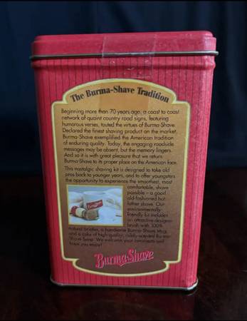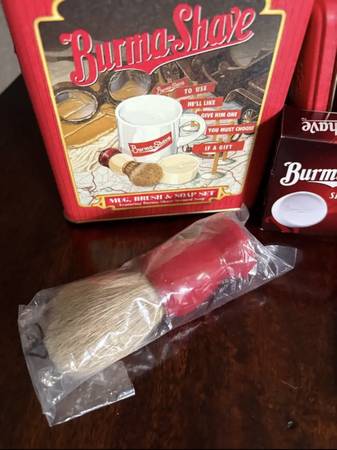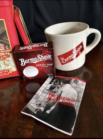 Featuring a nostalgic Burma-Shave Complete Gift Set: Mug, Brush, Scented Soap and Collectible Tin Box.