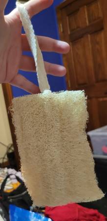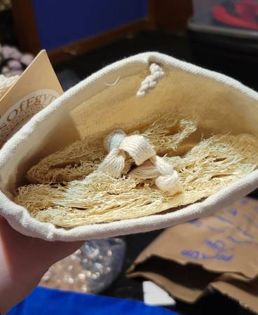 Two natural loofahs, never used. They came in a pack of three. Comes with pouch