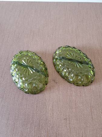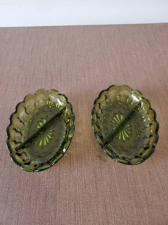 Vintage Anchor Hocking Fairfield Avocado Green Oval Divided Relish/Candy Dishes Measurements - 7" x 5" x 1.5" $15 each Cash only; no shipping