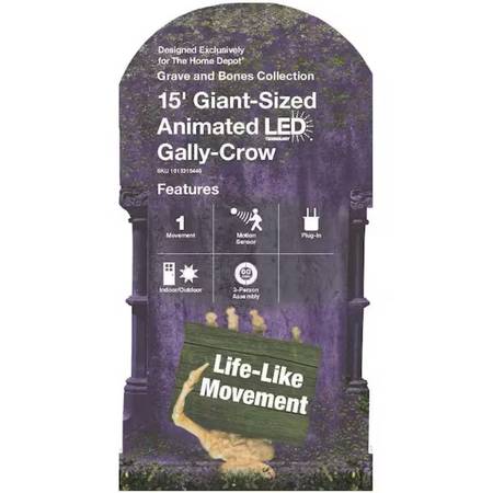 “Legend says that on Halloween night, the enemy of all scarecrows, an ominous protector crow, comes to life. The Home Accents Holiday 15 ft. Grave & Bones Giant-Sized Animated LED Gally-Crow has arrived at The Home Depot this Halloween season. Don't get too close or you might wake him once he detects your movement. With an LED light up flickering face and chest, a moving head, and realistic sculptural detail, this colossal creature is sure to impress your friends and neighbors alike. Ground stakes and timer included.