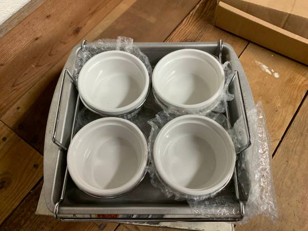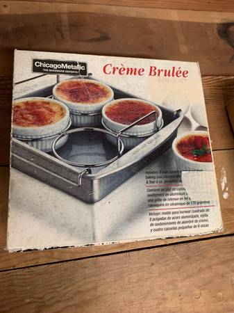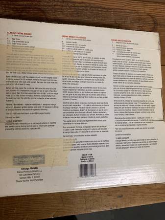 The Chicago Metallic Professional Crème Brulee Set includes six porcelain ramekins, perfect for creating classic crème brûlée dishes. These round ramekins are 3 inches in height and 9 inches in length, making them ideal for baking individual desserts. The set is dishwasher safe and features a non-stick surface coating for easy cleaning. The white ramekins are part of the Chicago Metallic brand, known for their quality and durability in the kitchen. New never used, does not have the box