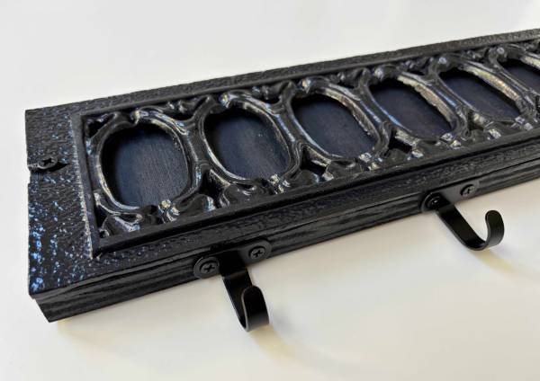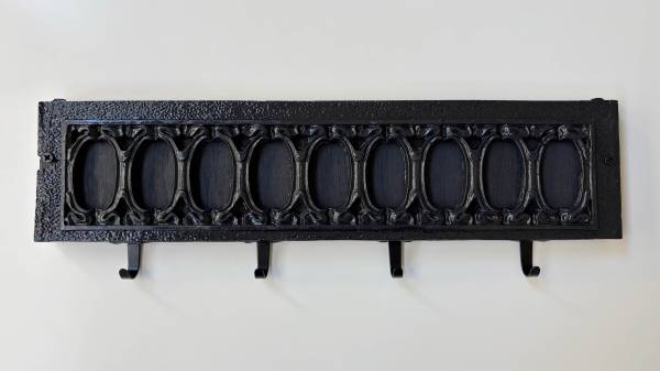 Salvaged Fireplace Grate repurposed as a COATRACK! Handmade by me,me,me,me! Measures 20" wide, 6.25"tall (including hooks), 1" deep. Fireplace grate glued and screwed together, stained black with four hooks to hang coats, hats or purses. Perfect useful decor piece for your foyer entryway or backdoor!