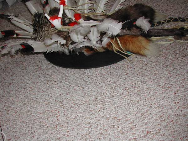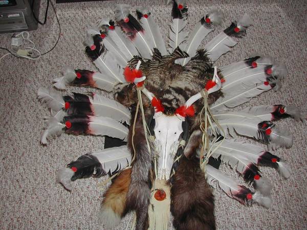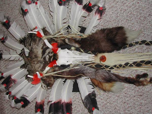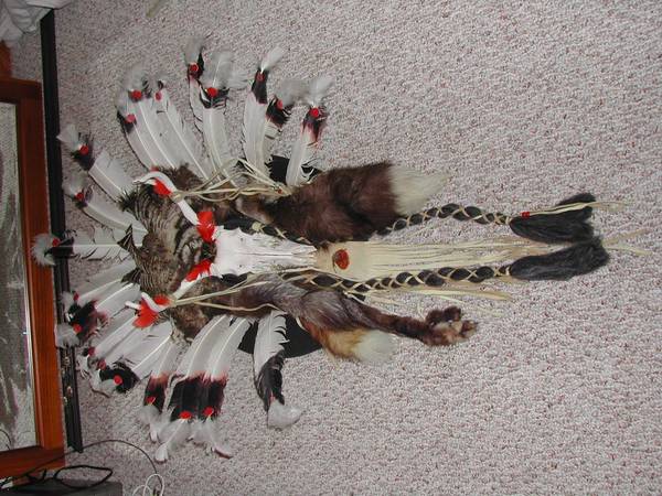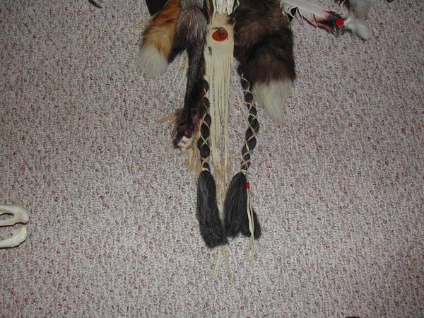 Nice feathers 5 (five) kinds, small cane pony skull, with two fox tails and two other tails, two braided horse hair braids, rawhide breast and tassels and metal beads and tiny pottery.