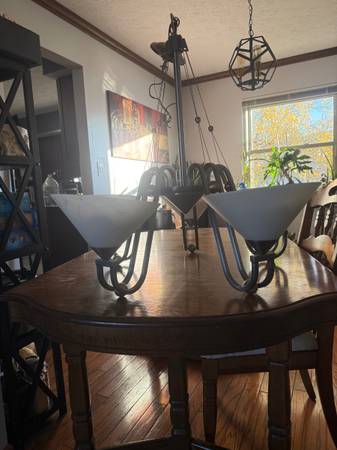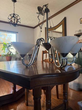Really nice dining room light. It’s mostly silver with a few brass accents. Fairly new bulbs as well. Just too large for our dining room as it hangs too low for us. It’s at the corner: 2073...