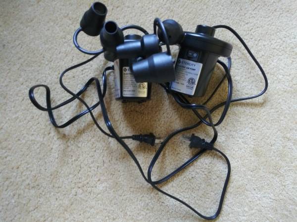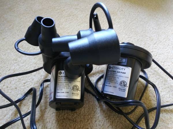 Two Etekcity Electric Air Pumps. Portable Pump for Air Mattress, Inflatables Couch, Pool Floats, Pool Raft Bed, Boat Toy, etc., in good condition, $3 each or $5 for 2.