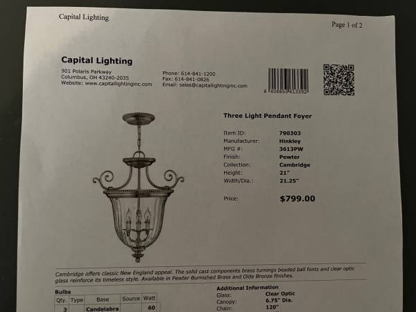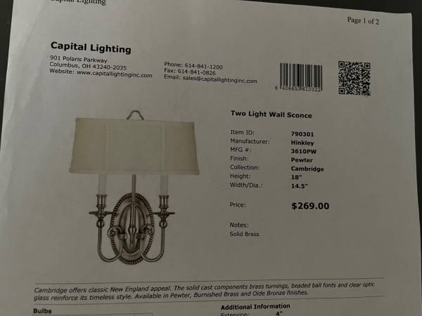 Sconces were $269.00 each from Capital lighting and a three light pendant was $799.00. Total was over $1600.00 ! All in excellent condition ! In for only 7 years. Just wanting to change things up. You will not get a better deal on almost new quality bathroom lighting. Feel free to search the Capital Lighting site to verify. I have included pictures from Capital and the room they were in as well! All four for $325.00