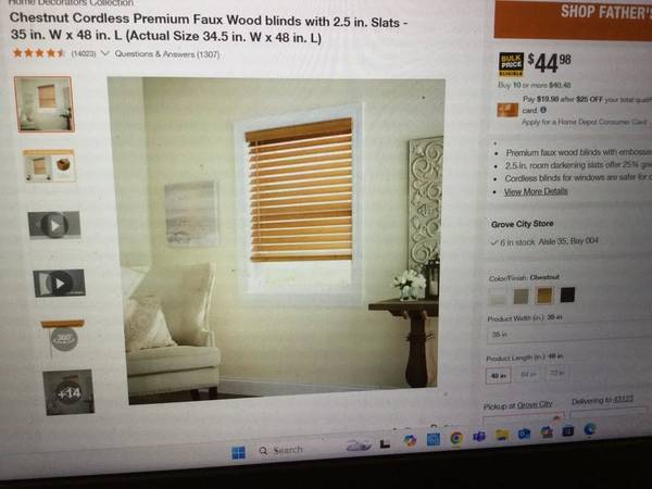 NO CARDS, CASH ONLY. NEW! Chestnut Cordless Premium Faux Wood blinds with 2.5 in. Slats - 35 in. W x 48 in. L (Actual Size 34.5 in. W x 48 in. L)