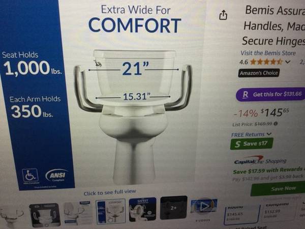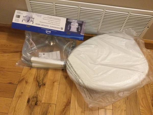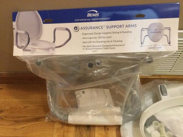 Cash only. New in box. Bemis Assurance 3" Raised Toilet Seat with Handles, Made in USA, Clean Shield Guard, Secure Hinges, Round, White