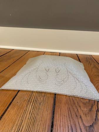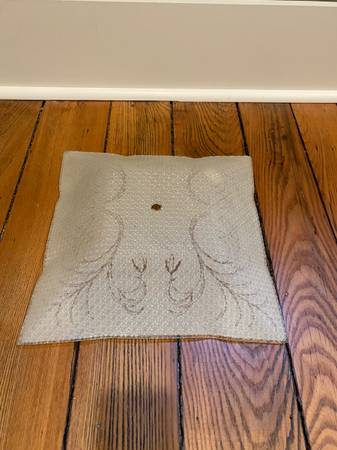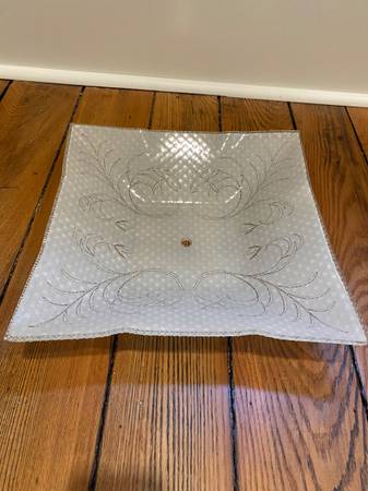 Vintage Flush Mount Replacement Glass. “New” with delicate subtle swirl vine pattern in light contrast to white pebble effect. Measures 13 ½”W x 13 ½ “L x 3”H Cash Only