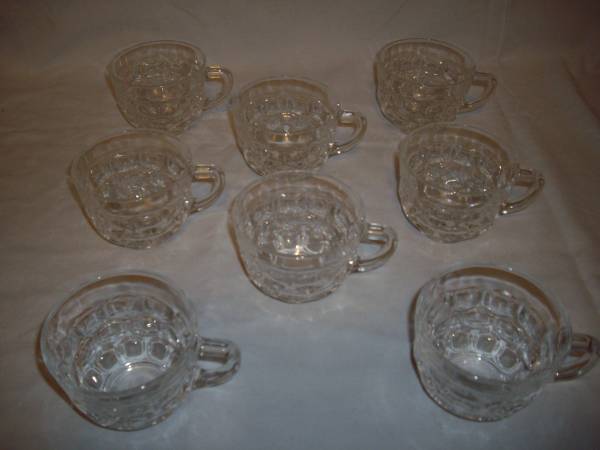 Made by Federal Glass Co. Mid-50's vintage individual serving trays with fancy glass cups. Use for formal/informal party to allow your guests to pick and choose appetizer, snack, etc., with the convenience to anchor a cup on the same tray! See photos for indentation in top of tray. Trays have a fancy bubble pattern that compliment the lightweight cup. Tray measures 10"W x 7"D x 3/4" H. Cup measures 3" diameter, 2,3/4" H.